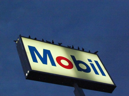 These pigeons were doing that swirly bird thing as the sun set. I happened to be at a gas station and thought I might try to capture them in a photo. They broke into two groups and flew in opposite directions, then half of them landed on this sign. I felt fortunate to be there, looking through the camera at them.
