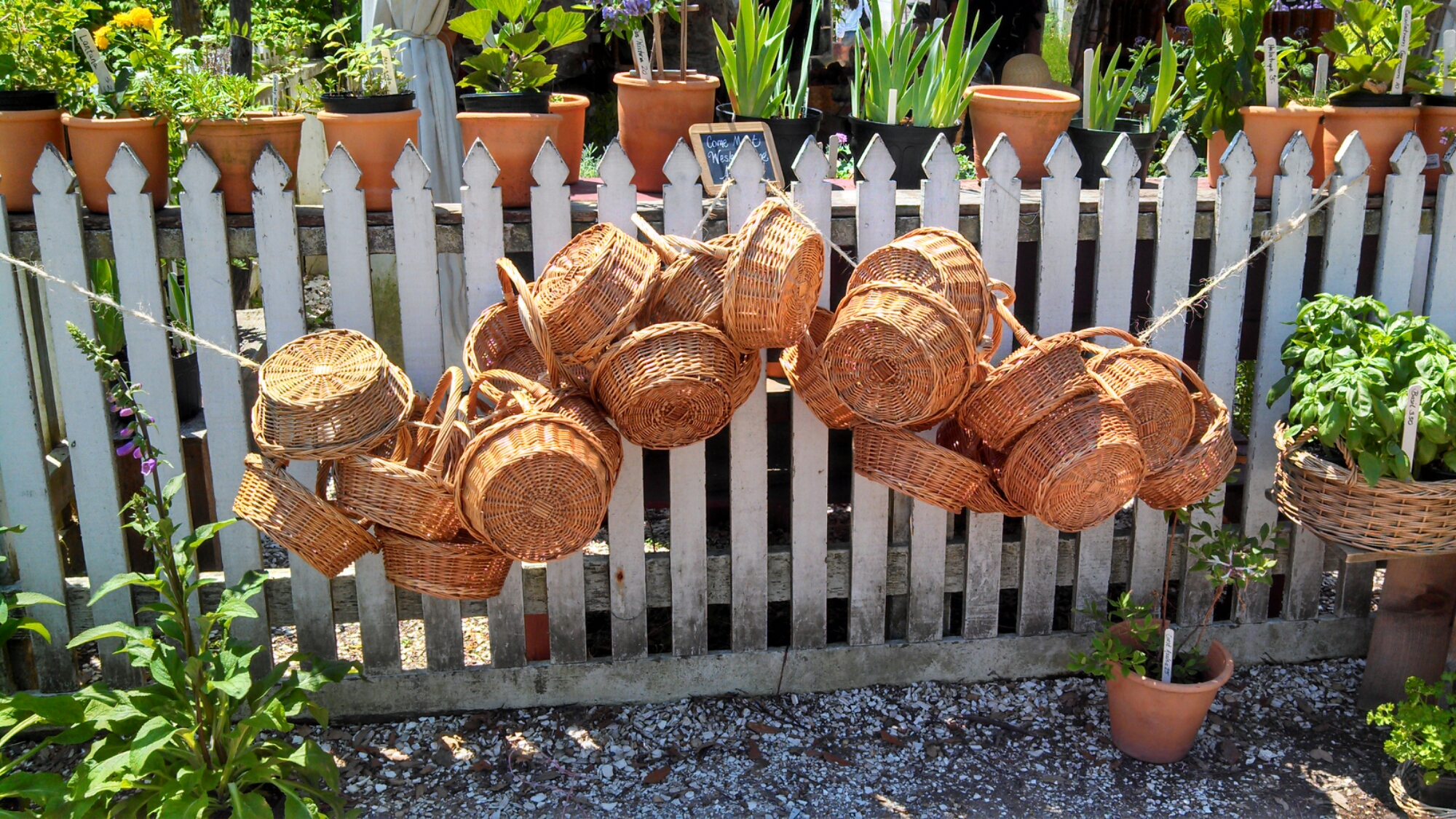Baskets on a fence.
