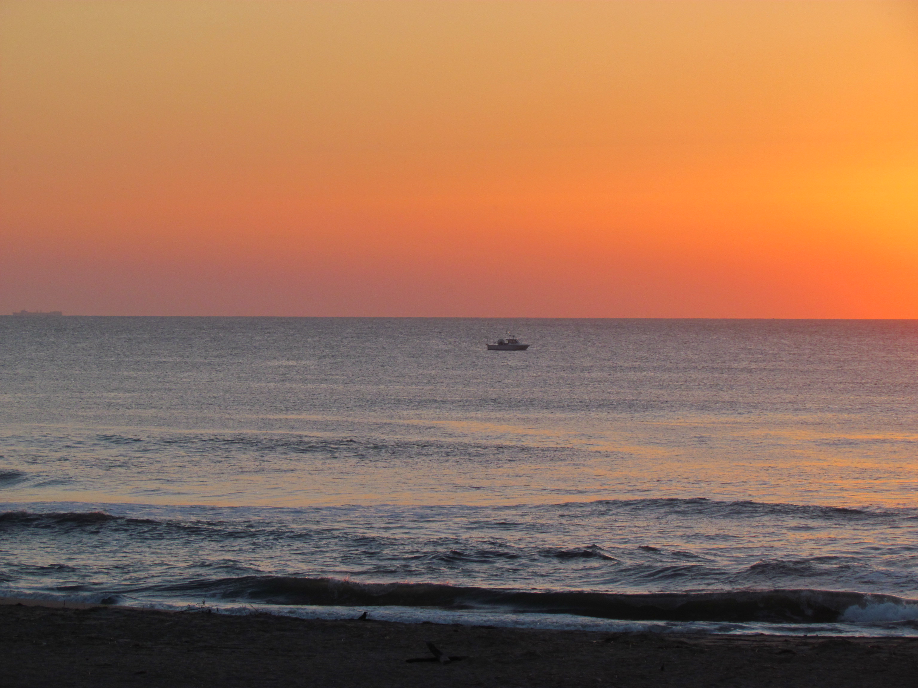 So, on this Tuesday morning, we took a minute or two to greet the sun. There was one fishing boat basking in the orange glow of the sunrise. Then I looked closer and saw the inevitable battle ship on the horizon. I like that it’s just a shadow and doesn’t really intrude on the magic of my personal space.