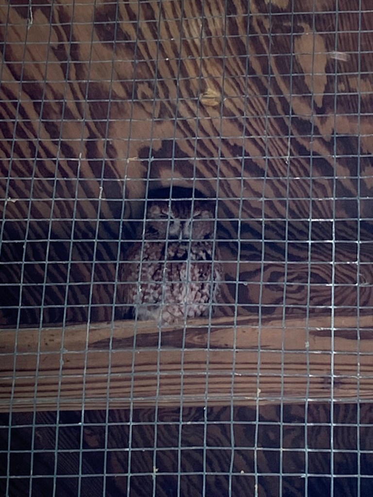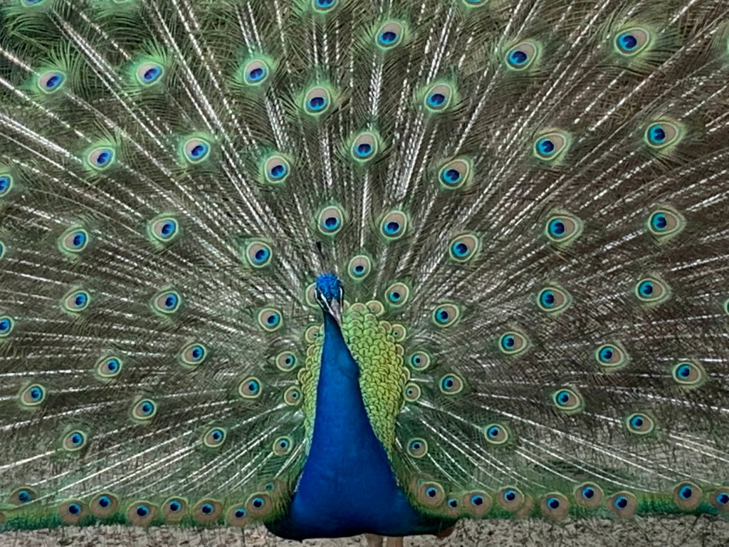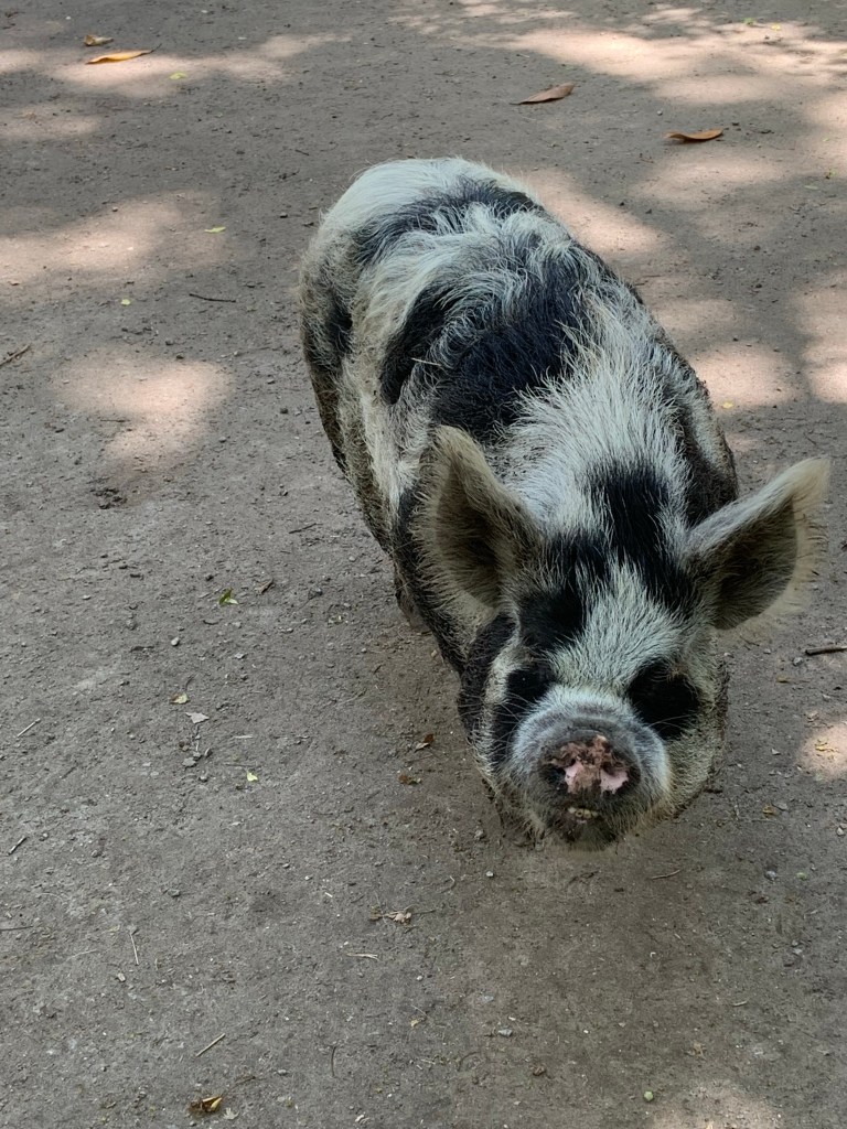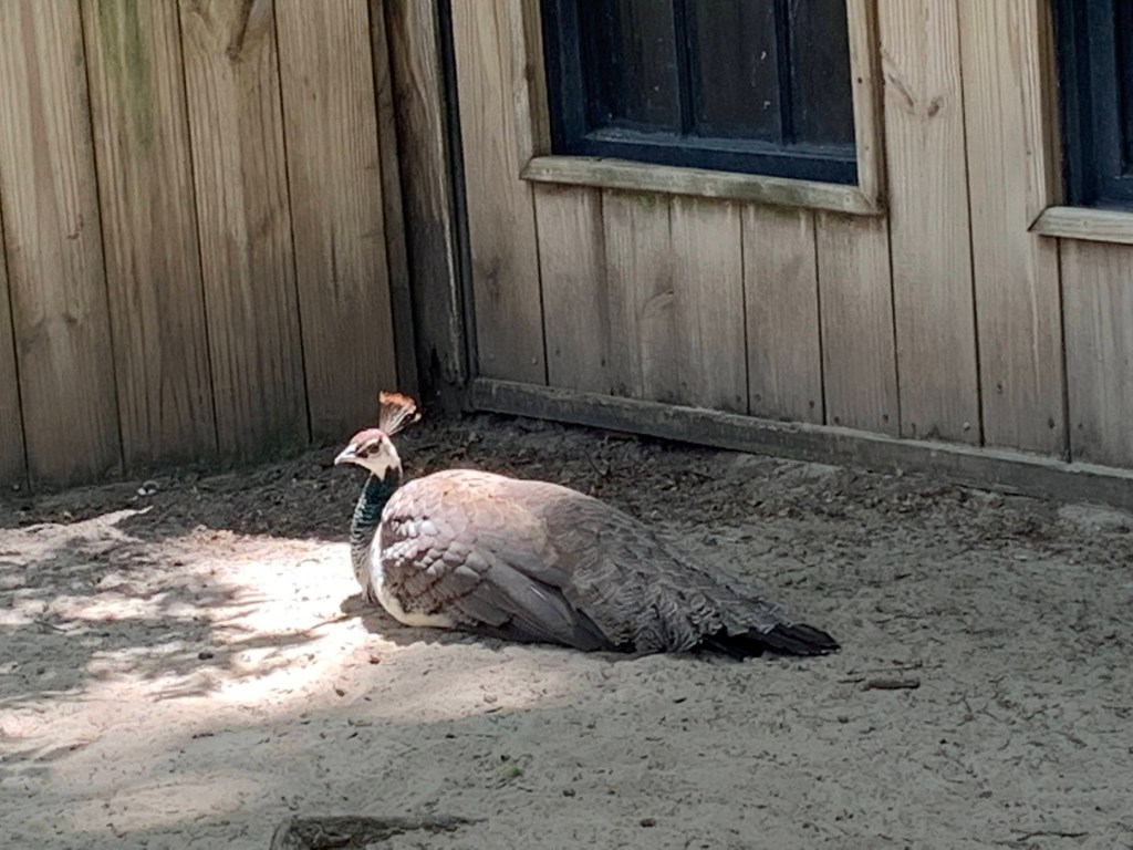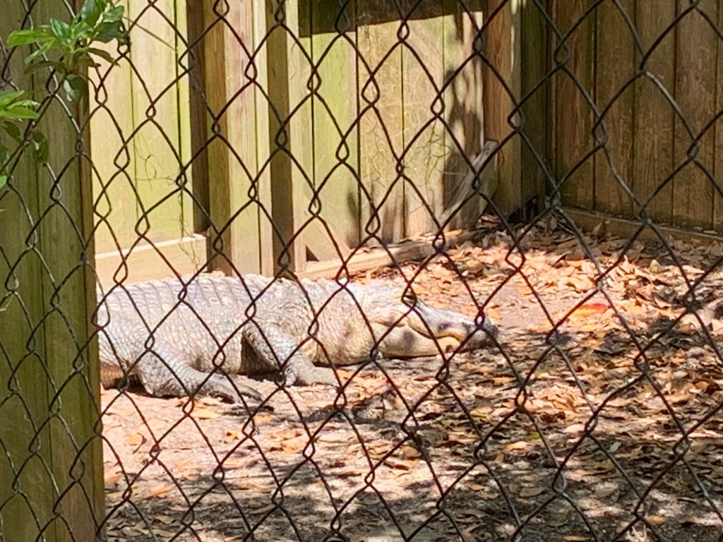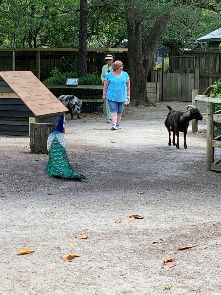 Then there was the zoo: Deer and a goat and a pig and a couple of noisy peacocks wandered around waiting for people to give them the treats that the place provided for a couple quarters. And chickens, several bossy chickens wandered around claiming territory, then moving on. In the fenced areas were turtles and owls and a white squirrel and snakes and a sleeping alligator. Lots of snakes, which I chose not to photograph.